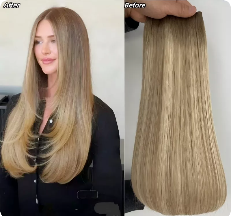 In the “before” stage, the hair bundles featured smooth straight textures in rooted brown-blonde shades. The quality and shine were already visible, suitable for professional use. “After” installation and salon styling, however, the look evolved into something much more striking. Volume increased, movement improved, and the color blending appeared more natural.